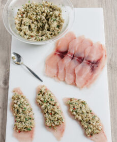 Appiattite leggermente le fettine di pesce e farcitele con il composto lasciando libere le estremità.
