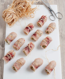 Arrotolatele racchiudendo bene il ripieno, poi legate gli involtini ottenuti con un giro di rafia, oppure fermateli con 2 stecchi.