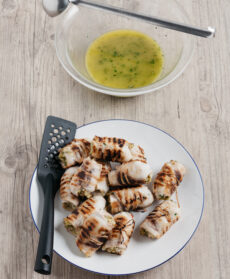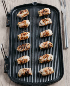 Scaldate bene una griglia unta di olio e cuocete gli involtini per 6-8 minuti, girandoli da tutte le parti senza pungerli.