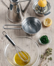Preparate la salsa, sbattete 1 bicchiere di olio in una ciotola con una frustina emulsionandovi 2-3 cucchiai di acqua calda, aggiungete il succo del limone, mezzo cucchiaio di prezzemolo, l'origano e l'aglio rimasto schiacciato (che poi eliminerete).