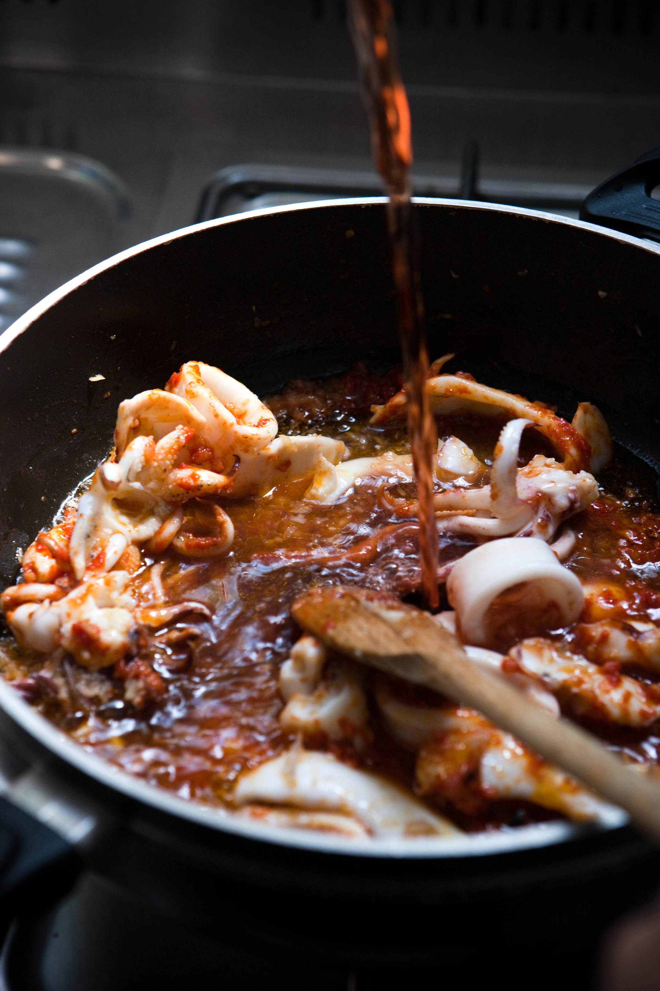 2) Aggiungi ancora il concentrato di pomodoro, mescolando lentamente, e versa l’aceto. Pepa il tutto e poi aggiungi un mestolo di acqua. Porta ad ebollizione il sugo e aggiungi i rimanenti pesci fatti a pezzetti. Quando aggiungi il pesce abbi cura di immergere in cottura prima il pesce con più polpa come lo scorfano e poi quello più tenero come la triglia. Metti il sale e cuoci per 15 minuti.