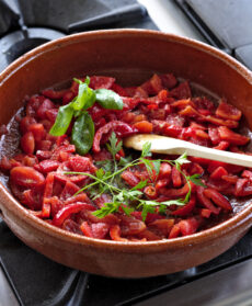 Sbollentate i pomodori maturi da sugo, sbucciateli, tagliateli a filetti. Tagliate a listarelle anche il peperone. Fate soffriggere in un tegame in terracotta l’olio, l’aglio, e i peperoncini. Aggiungete il pomodoro e il peperone rosso dolce, 2-3 ciuffi di basilico e di prezzemolo. Cuocete per circa 10 minuti.