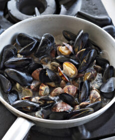 Ammollate le vongole in acqua salata per un’ora, fino a che avranno espulso tutta la sabbia. Lavate e spazzolate le cozze. Versate i molluschi in una pentola antiaderente fateli aprire a fuoco.