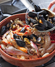 Aggiungete poi calamaretti, sogliole, triglie e, infine, canocchie e scampi. Cuocete per altri 10 minuti. Fate attenzione a non mescolare il pesce per non frantumare i pezzi, ma muovete delicatamente il tegame avanti e indietro.