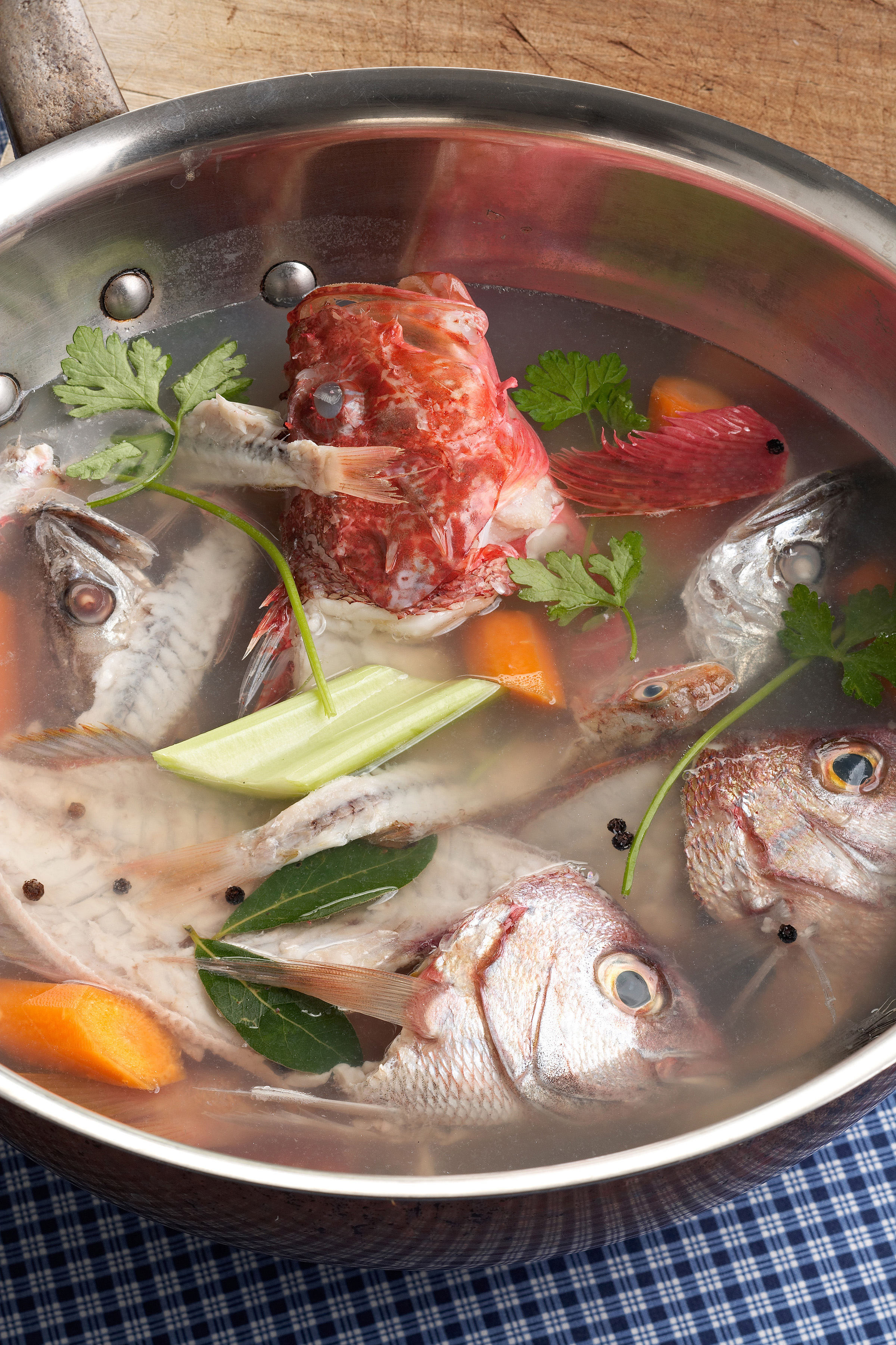 1) La ricetta del brodetto ricco con crostoni di pane inizia con la pulizia dei pesci (scorfano, palombo, triglie, cappone, pescatrice, pagello, merluzzetti). Sotto abbondante acqua fredda eviscera i pesci e squamali. Togli lische e teste e poni il pesce pulito in un vassoio. Prendi gli scarti del pesce e lasciali cuocere in una pentola assieme alla carota, ad una cipolla, al sedano e all'alloro. Pepa e copri con abbondante acqua. Dopo aver fatto sobbollire per circa 30 minuti, passa gli scarti di pesce e le verdure al setaccio e filtra il brodo ottenuto.