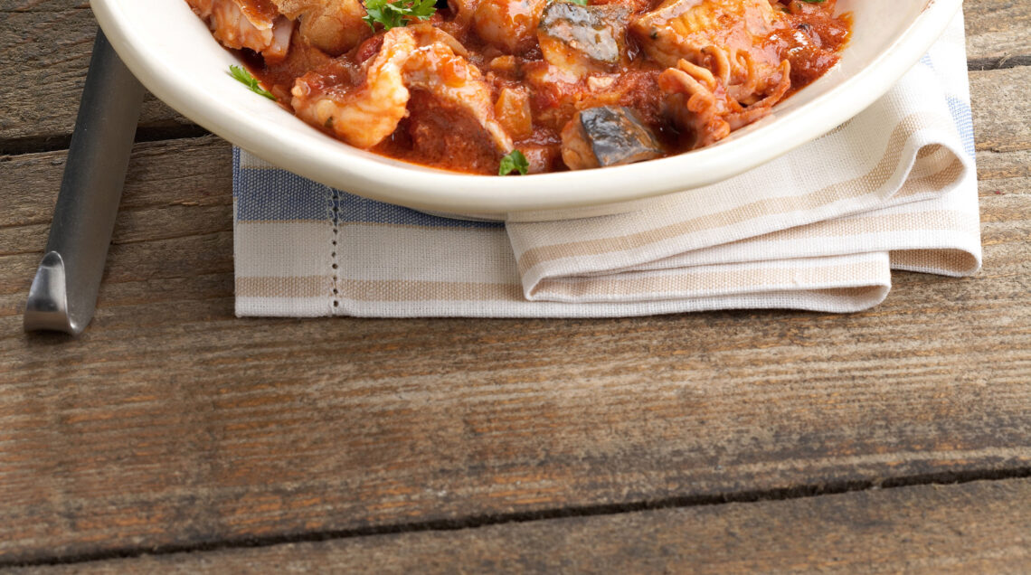 2) Prendi la cipolla restante e tritala con aglio e prezzemolo. Fai soffriggere il trito in una pentola con un filo d'olio. Unisci i calamaretti. Aggiusta di sale e di pepe, aggiungi il vino e lascia evaporare a fuoco medio. Aggiungi il pomodoro e, poco dopo, il brodo del pesce, mescolando. Quando il brodo inizia a bollire, versa i pesci partendo da quelli più polposi. Cuoci per circa 15 minuti a fuoco lento e poi lascia riposare a fuoco spento.