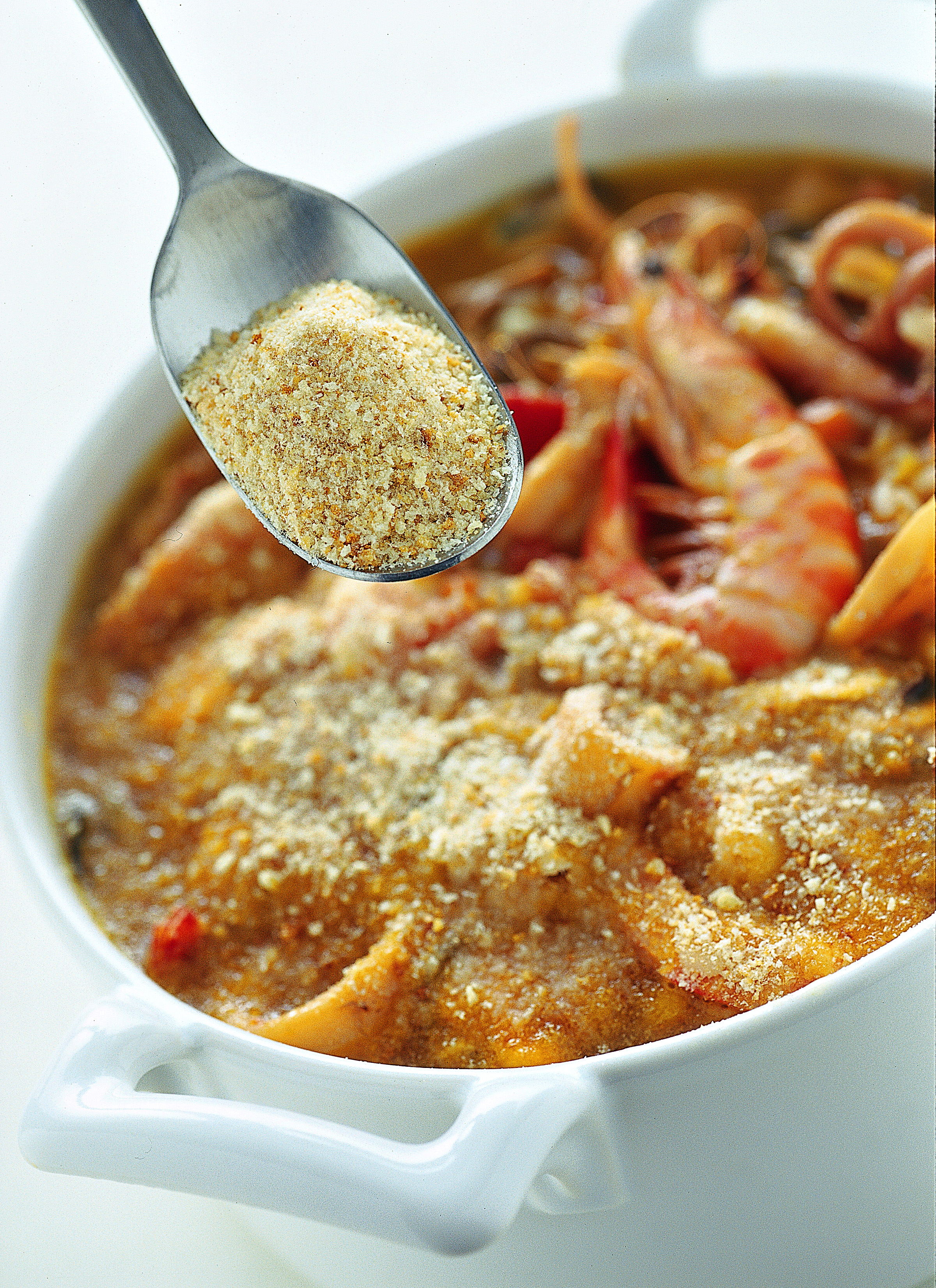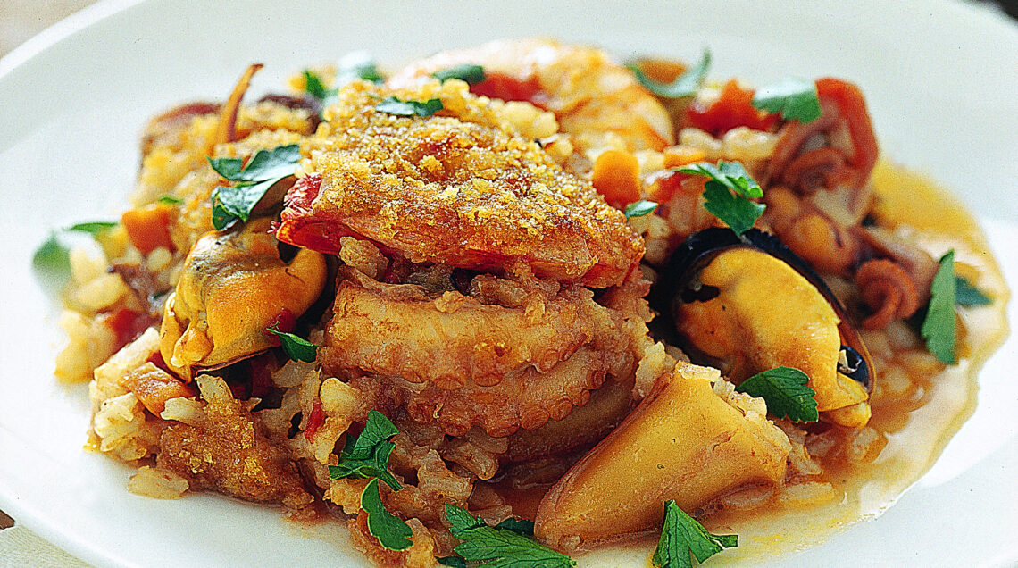 3) Lessa il riso avendo cura di lasciarlo cuocere per soli 10 minuti. Versa il riso nel sugo di funghi ed aromi, aggiungi gamberi e cozze. Filtra con un passino l’acqua delle cozze ad aggiungi al sugo. Prendi una pirofila, cospargi di olio e poi versa il contenuto della casseruola al suo interno. Cospargi il tutto di pangrattato, aggiungi prezzemolo tritato, un filo d’olio e fai cuocere in forno ventilato per 15 minuti a 180°. La ricetta della buridda di pesce è pronta per essere servita.