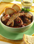 Il cacciucco, qui presentato nella sua versione alla viareggina, è la celebre zuppa di pesce toscana nata a Livorno ma diffusa in tutto il litorale. La nostra ricetta è preparata con diverse qualità di pesce, dalle triglie allo scorfano, molluschi cefalopodi come polpo, seppie e moscardini, crostacei “poveri” ma saporiti come le cicale (dette anche canocchie o pannocchie) e le note decise del vino rosso, della salvia e del peperoncino piccante. Abbinamento d’obbligo, il pane “sciocco”, ovvero senza sale, che raccoglie il meraviglioso brodo di mare.