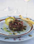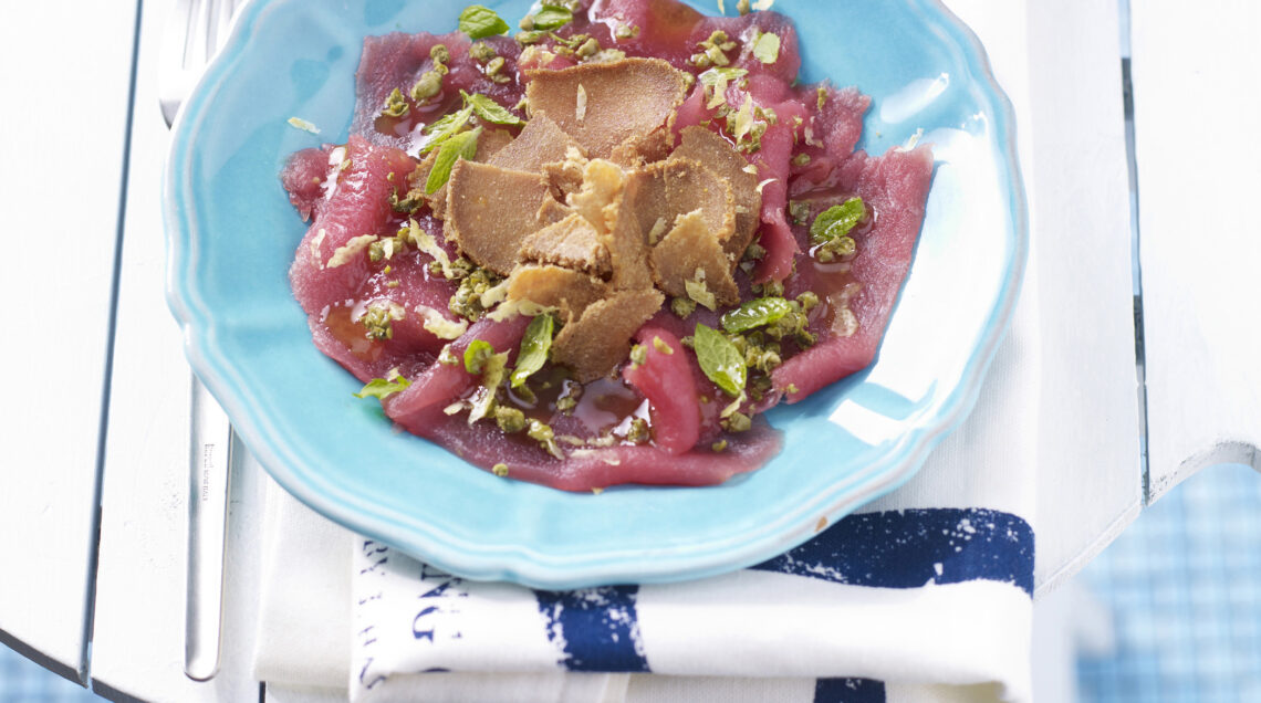 3) Togliete il tonno dal frigo, distribuite i capperi tritati e qualche fogliolina di menta; suddividete al centro di ogni piatto la bottarga affettata, condite con un filo d'olio extravergine d'oliva e servite.