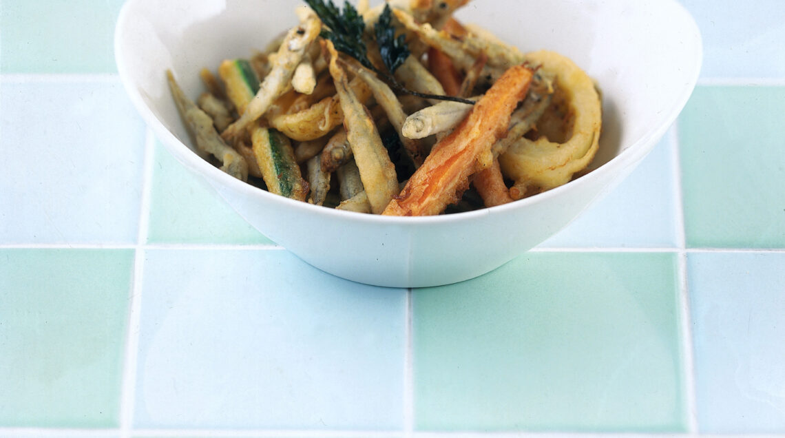 4) Metti a scaldare una pentola contenente dell’olio. Immergi le verdure nella pastella e poi tuffale nell’olio. Quando saranno dorate, toglile dalla pentola e falle asciugare su un foglio di carta assorbente. Ora infarina i pesciolini, falli friggere nell’olio e poi falli asciugare. Prepara le porzioni mettendo in ogni piatto dei pesciolini e delle verdurine.