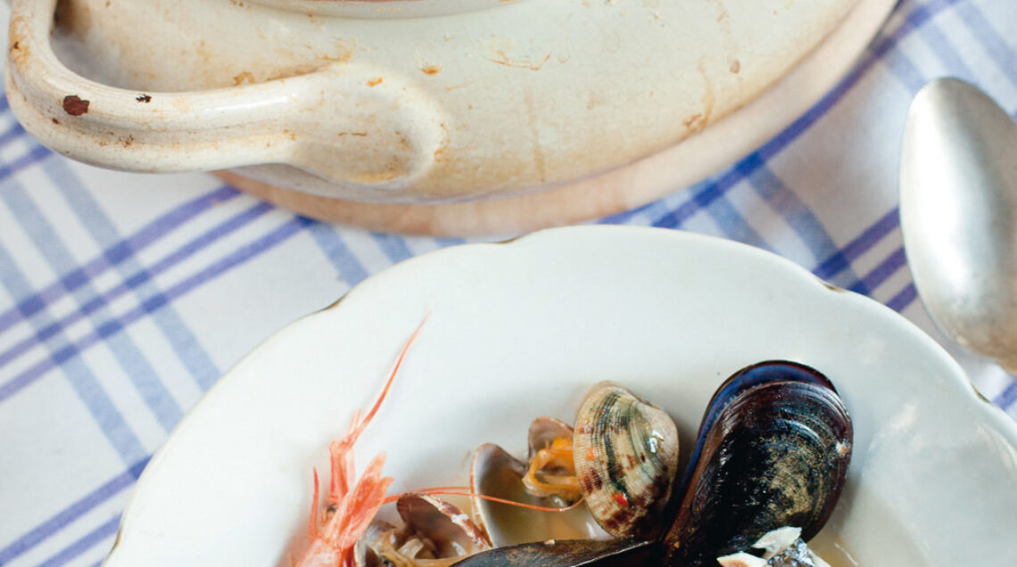 1) Versa l’olio in un ampio tegame di coccio, adagiaci i pomodori, le cipolle, l’aglio non sbucciato, le olive sgocciolate e, per ultimi, i molluschi, i gamberetti e il branzino.