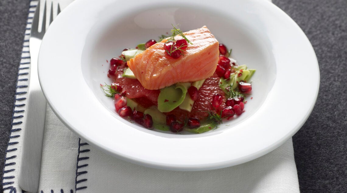 4) Disponi il pesce sopra il pompelmo, cospargi il tutto con i chicchi di melagrana, l'aneto, il pepe rosa sbriciolato e servi.