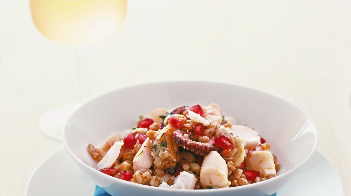5) Unisci i chicchi della melagrana, aggiusta di sale e di pepe, mescolala bene e gusta l’insalatina tiepida al sapore di mare.