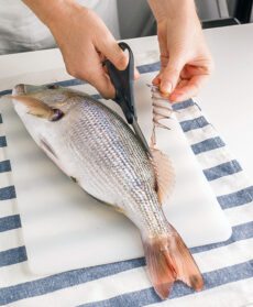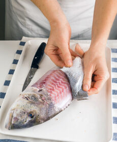 Tagliate le pinne del dentice, evisceratelo e sciacquatelo accuratamente.