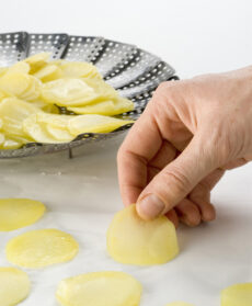 Sbucciate le patate, tagliatele a rondelle di 4-5 mm di spessore e cuocetele a vapore per 4-5 minuti (in alternativa sbollentatele per 30 secondi in acqua bollente salata, scolatele e raffreddatele un poco sotto il getto d'acqua corrente); infine fatele raffreddare allargandole su un foglio di carta da forno.