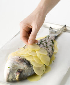 Sistemate l'orata sul fondo di patate e copritela con le fettine di patate imitando la disposizione delle squame. Spennellate le patate con un po' d'olio e cuocete in forno a 200° per circa 10 minuti e per altri 10 a 180°. Per ottenere una crosticina croccante, spennellate le patate con poco burro fuso e passate ancora 2 minuti sotto il grill finché saranno ben dorate.