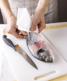 Incidete la pelle dell'orata subito sotto la testa, partendo dal centro: sollevatene un lembo con la punta di un coltello tutto intorno all'attaccatura della testa, sotto le branchie. Incidete la pelle anche lungo il dorso e la pancia. Afferrate un lembo di pelle con un telo pulito e staccatela dalla polpa, tirandola dolcemente verso la coda. Ripetete l'operazione anche sull'altro lato.