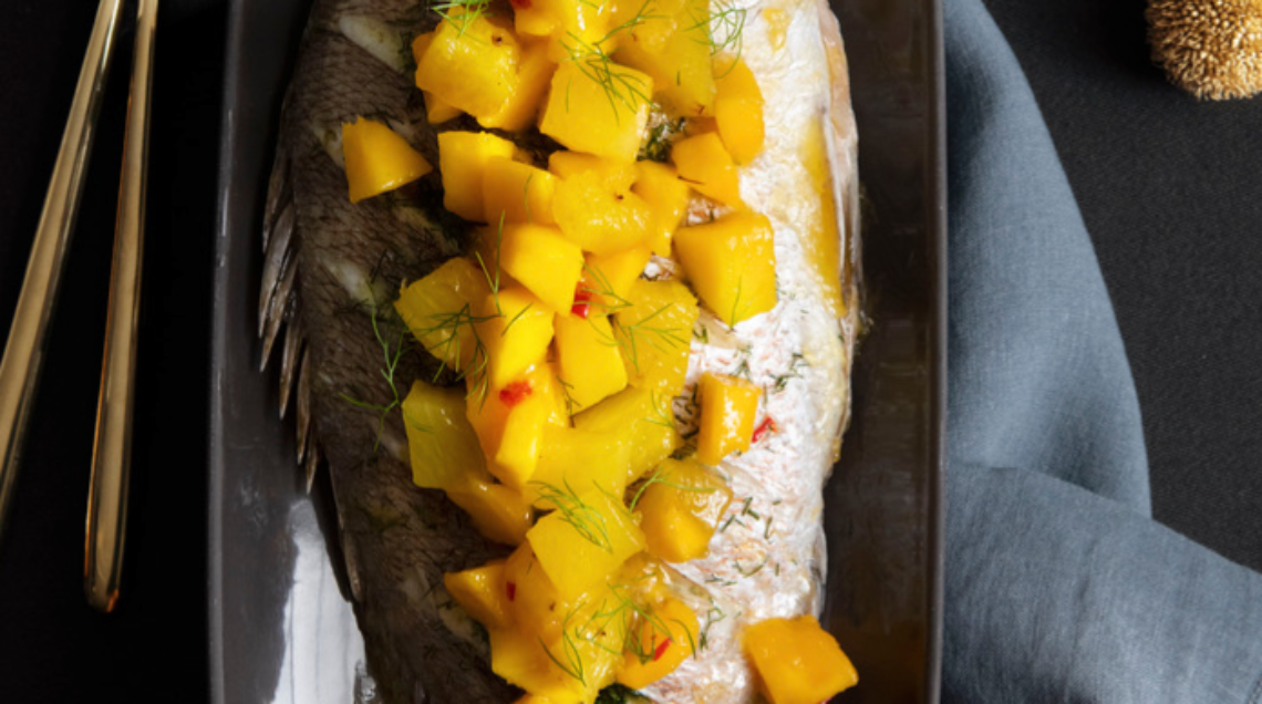 La frutta esotica, acidula e dolce, aggiunge un tocco creativo a un pesce delicato. Lo sciroppo speziato rende le carni morbide e profumate
