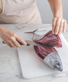 Per schiarire le carni del tombarello, ricche di sangue, lasciate a bagno i filetti per 30 minuti in acqua fredda salata. Anche palamita e alletterato, pur avendo la polpa più chiara, possono essere ingentiliti con questa tecnica.