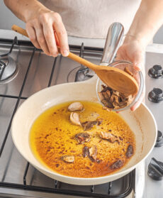 Scaldate in una padella 3 cucchiai di olio con gli spicchi di aglio non sbucciati, quindi stemperatevi i filetti d'acciuga con l'aiuto di una forchetta. Unite i porcini sgocciolati e tritati, salate e cuocete per 10 minuti coperto.