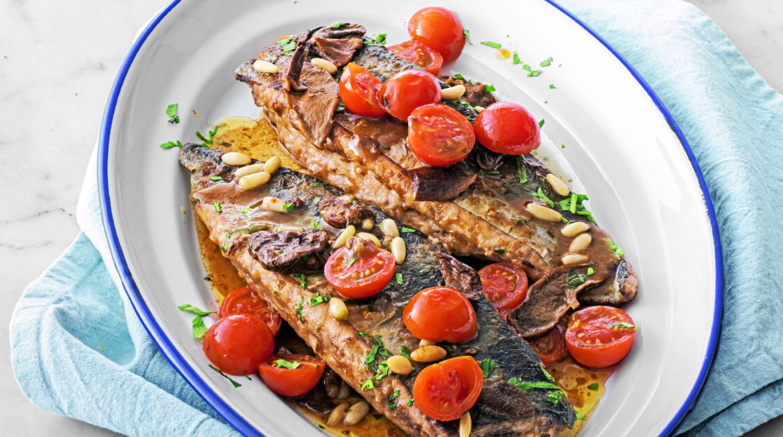 Un secondo di pesce alla maniera ligure. Con pomodorini, acciughe, pinoli e funghi secchi è saporitissimo
