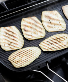 1) Prepara gli ingredienti. Lava le melanzane sotto acqua corrente, asciugale, spuntale e tagliale a fette dello spessore di circa 1/2 cm; scalda bene una griglia e abbrustolisci le melanzane 1-2 minuti per lato. Mettile su un piatto e salale leggermente. Taglia il pesce spada a fettine molto sottili. Sfoglia il basilico, lava velocemente le foglie e mettile ad asciugare su un telo.