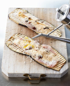 3) Condisci. Insaporisci le fettine di melanzane e il ripieno con 1 macinata di pepe e un filo di olio extravergine di oliva.