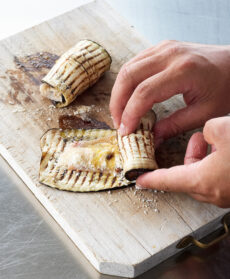 4) Fai gli involtini. Avvolgi le melanzane e racchiudi bene il ripieno in modo da ottenere degli involtini; compattali con le mani in modo che rimangano chiusi senza legarli. Appoggiali su una placca foderata con carta da forno e cuocili in forno caldo a 250° per 6 minuti.