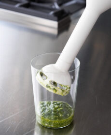 5) Prepara la salsina. Frulla il basilico con i rimanenti pinoli, l'aglio e 1 bicchiere scarso di olio extravergine di oliva; aggiungi 2 cucchiai di pecorino e frulla ancora per qualche secondo: dovrai ottenere una salsina fluida (eventualmente unisci ancora 1 filo di olio).