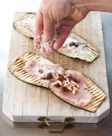 2) Farcisci le fettine di melanzane. Sistema le fette di melanzane abbrustolite sul piano di lavoro e avvicinale a due a due di modo da sovrapporle un poco. Adagia su ciascuna fetta di melanzana, 1 fettina di spada. Distribuisci sul pesce metà dei pinoli, l'uvetta, 1 cucchiaio di pecorino grattugiato e completa con il pangrattato.