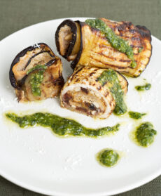 6) Completa. Suddividi gli involtini di melanzane e pesce spada sui piatti, cospargili con un po' di salsa al basilico e il rimanente formaggio e servi con la salsa rimasta.