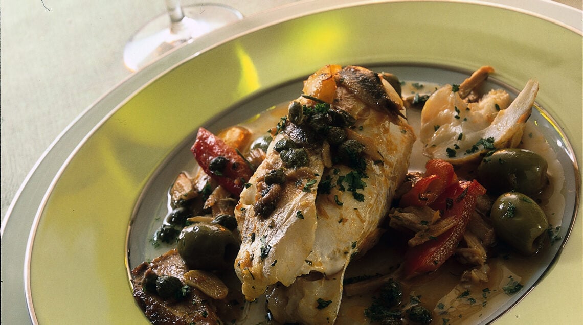 4) Cospargi il filetto di merluzzo con 2 cucchiai di prezzemolo, tritato con uno spicchio di aglio, ripiegalo a metà e sistemalo in una pirofila unta di olio. Versaci sopra la salsa preparata e continua la cottura in forno caldo a 180° per 20 minuti. Servi subito il merluzzo in salsa mediterranea.