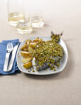 3 Servite in tavola il pesce nella crosta di sale, spaccatela con un colpo secco utilizzando un batticarne. Dividete il pesce in porzioni servendolo sui piatti individuali con un filo di olio.