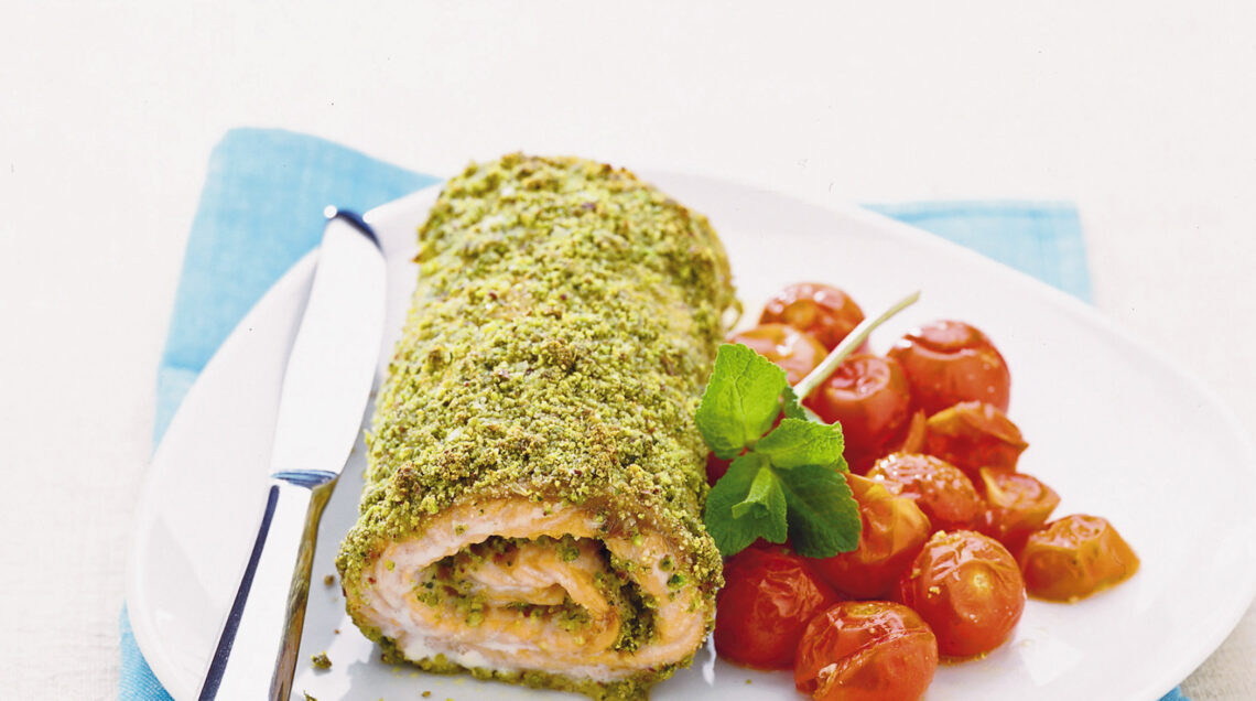 2) Trita nel mixer il pangrattato con la scorza del limone, i pistacchi e le foglie di menta. Sala e pepa la parte interna del salmone e distribuiscici un po' del trito. Arrotolalo e legalo.