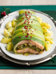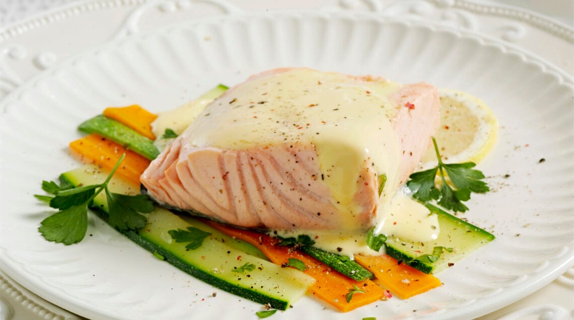 3) Posa un salmone pulito e squamato di 1,5 kg sul vassoio della pesciera e immergilo nel court bouillon. Cuoci a fuoco basso per 20 minuti, solleva il vassoio, fai sgocciolare il pesce, poi sfilettalo e taglialo in porzioni.