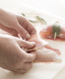 Tastate con le dita i filetti di orata ed eliminate le eventuali spine rimaste con una pinzetta, lavateli e asciugateli con carta da cucina. Disponete sul piano di lavoro le fette di prosciutto, adagiate su ciascuna 1 filetto di pesce e chiudete a portafoglio. Aggiungete una foglia di salvia su ciascuno e fermateli con uno stecchino.