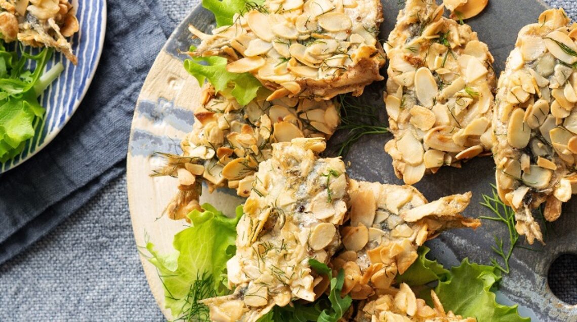 2 Passate le coppie di sarde prima nella farina poi nelle uova, leggermente sbattute con una manciatina di finocchietto tagliuzzato. Infine, passatele nelle lamelle di mandorle, facendo in modo che queste aderiscano uniformemente alla superficie dei sandwich di sarde.