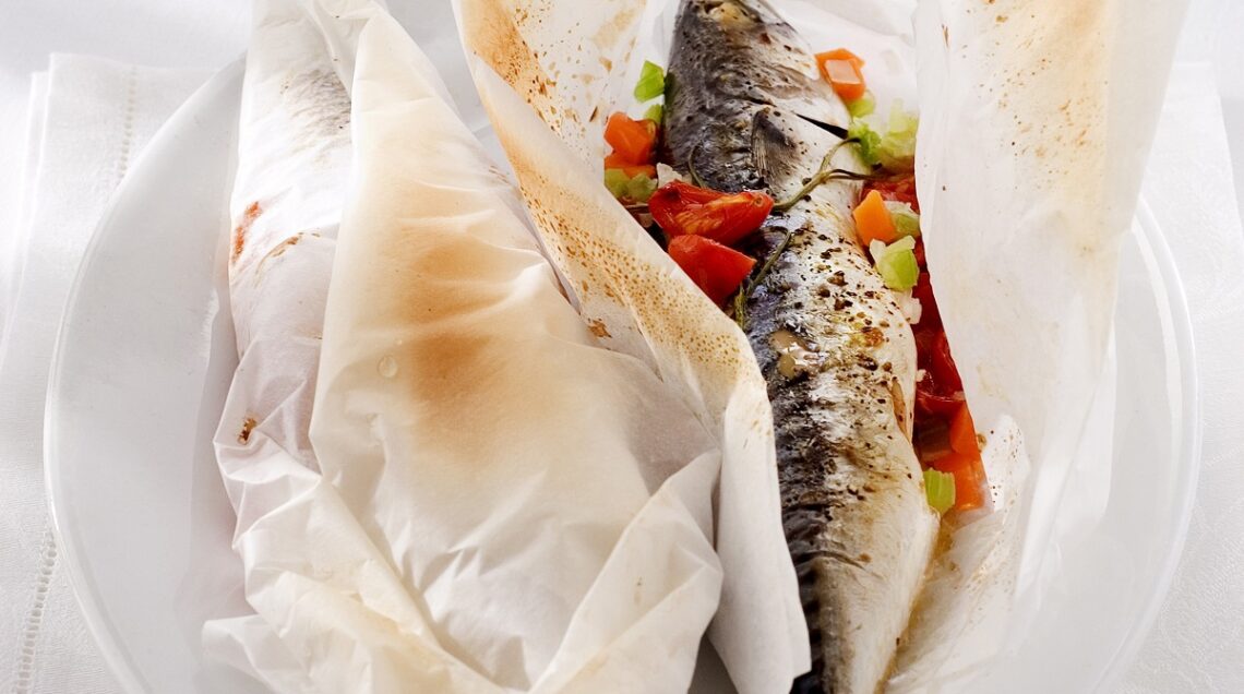 1) Insaporite 4 piccoli sgombri (già puliti) con un trito di aglio e prezzemolo, salateli e sistemateli su 4 fogli di carta da forno con qualche dadino di pomodoro e di peperone verde