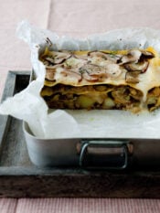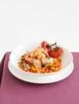 1) Taglia lo spada a tocchetti, spolverizzalo con la farina e mescola. Raccogli in un tegame 4 cucchiai di olio, l'aglio tagliato a metà, la cipolla affettata e l'alloro. Scalda per 5 minuti, aggiungi lo spezzatino e fallo insaporire per altri 5 minuti, mescolando 2-3 volte.