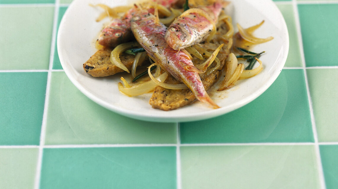 3) Trita finemente la cipolla e l’aglio e falli rosolare in una padella con 3 cucchiai di olio d’oliva. Unisci le triglie, il rosmarino e il vinsanto, poi aggiungi sale e pepe a tuo piacere e fai cuocere per 10 minuti. Togli dal fuoco e impiatta, adagiando su ogni fetta di panissa le triglie: le tue trigliette con panissa alle nocciole sono pronte da portare in tavola.