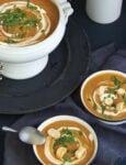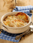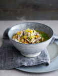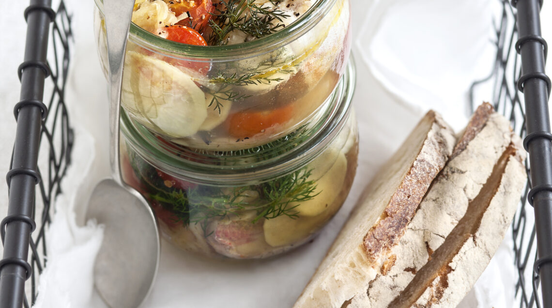 3) Pela e taglia la patata a fette sottili con la mandolina. Distribuisci i ciliegini rimasti sul fondo di 4 barattoli di vetro ermetici di 4 dl di capacità, copri con uno strato di patate e un cucchiaio di cipolle. Suddividi i pesci nei vasi alternandoli con cipolle e ciliegini e fette di patate. Inserisci in ciascun barattolo 1 mazzetto guarnito, bagna con il brodo (1,2 dl circa ognuno), chiudi e cuoci a vapore per 20 minuti circa la zuppa di pesce prima di servirla.