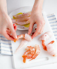 Condite i filettini di sogliola con un filo d'olio extravergine d'oliva, qualche granello di pepe rosa e un pizzico di sale. Scottate in acqua bollente le strisce di porro. Avvolgete ogni filettino di pesce attorno a una coda di gambero sgusciata.