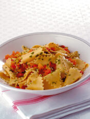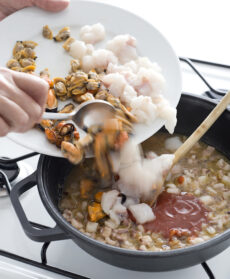 Aggiungete il concentrato di pomodoro, sciolto in poca acqua, i pezzi di pescatrice e cuocete ancora per 5 minuti. Unite gamberi, vongole e cozze, cuocete per 1 minuto, profumate con il prezzemolo tritato. Regolate di sale e pepate.