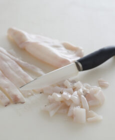 Tagliate i calamari, la pescatrice e i gamberi a pezzettini, tenendoli separati. Fate appassire gli scalogni sbucciati e tritati in una padella con poco olio; unite i calamari e, dopo 2 minuti, sfumate con il vino; coprite e proseguite la cottura per 30 minuti, bagnando di tanto in tanto con il liquido delle cozze e delle vongole.
