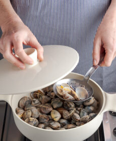 Mettete le vongole in una padella con un filo d'olio e 1 spicchio d'aglio; coprite e fatele aprire a fuoco vivo. Sgusciatele, filtrate il liquido di cottura e tenetelo da parte. Pulite le cozze, eliminando il bisso, e preparatele con poco olio e l'aglio rimasto.