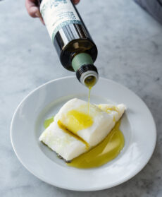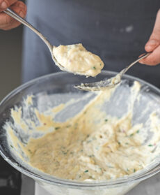 Profumate il baccalà con olio extravergine e rosmarino, spezzettatelo e unitelo al composto preparato con il prezzemolo, un pizzico di sale e lo scalogno tritato.