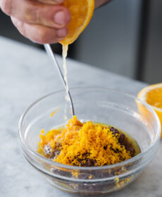 Frullate il paté di olive con l'olio, l'aceto, un pizzico di peperoncino e la scorza d'arancia grattugiata.