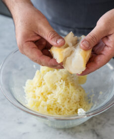 Impastate in una ciotola le patate con la farina, le uova e il lievito di birra sciolto in 80 ml di acqua.