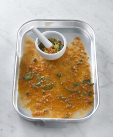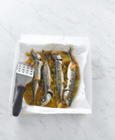 Togliete gli sgombri dalla marinata, affiancateli in una teglia rivestita con la carta da forno e distribuitevi la metà della