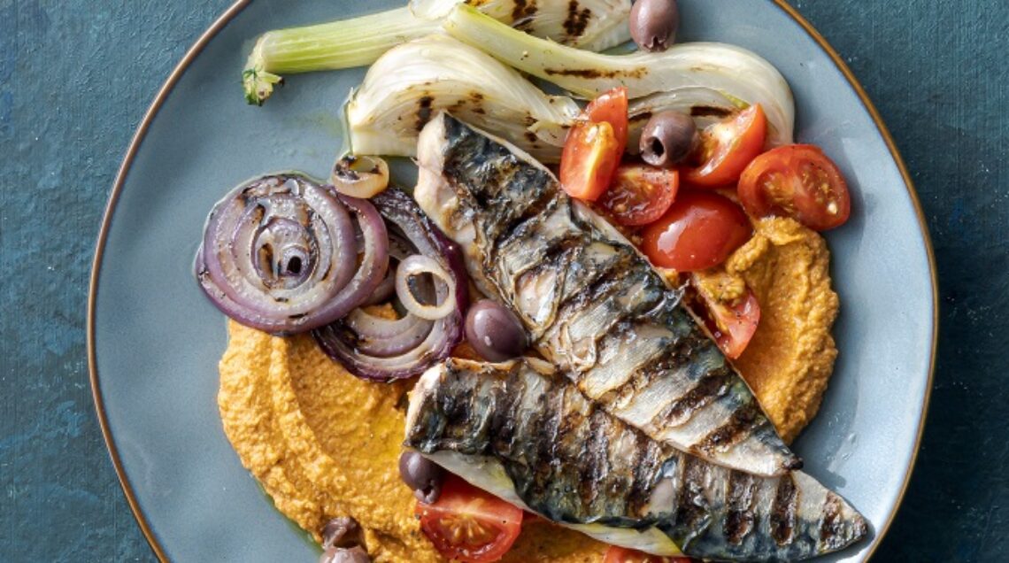 4) Disponete nei piatti finocchi, cipolle, una decina di olive nere denocciolate e di pomodorini ciliegia tagliati a metà, aggiungete il pesce e accompagnate con la salsa romesco.